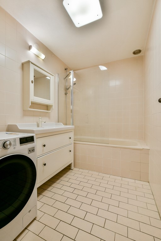 Badkamer met ligbad, wastafelmeubel en wasmachine