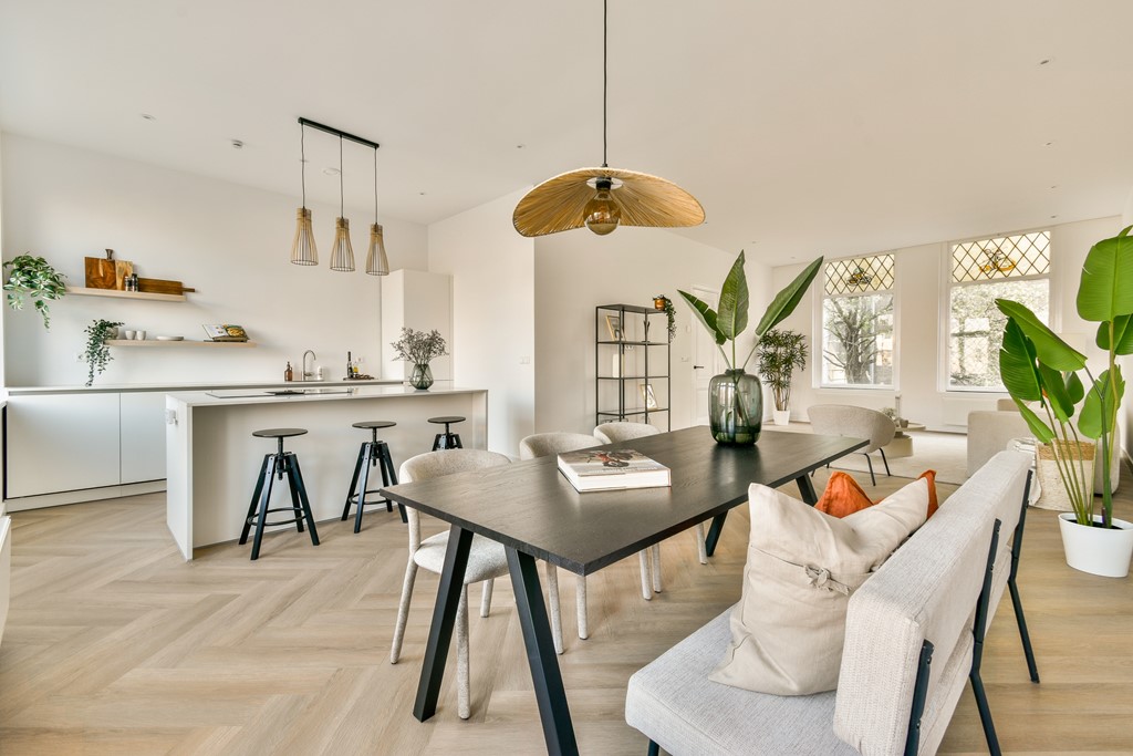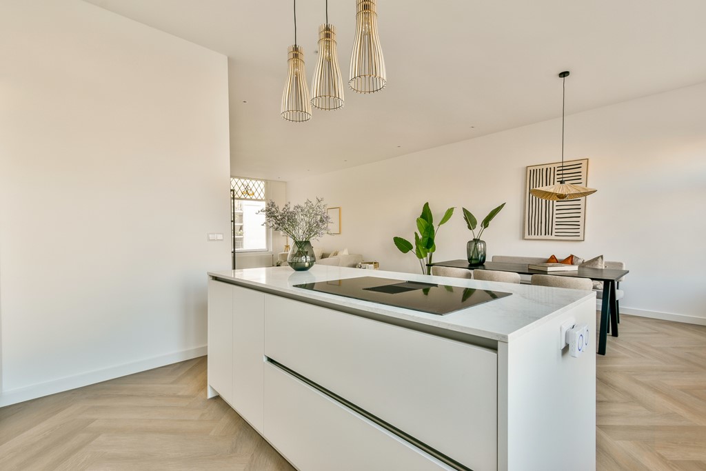 De open keuken met kookeiland vormt het kloppend hart van de woning—een perfecte plek om te koken, leven en samen te komen.
