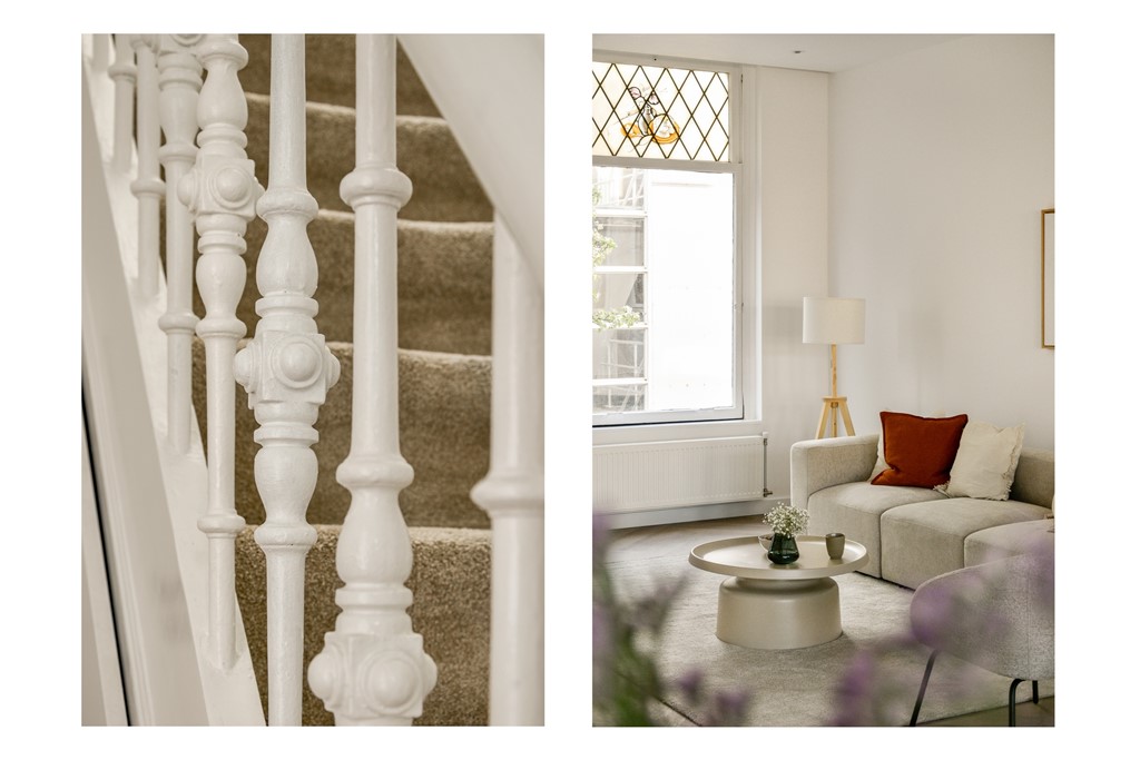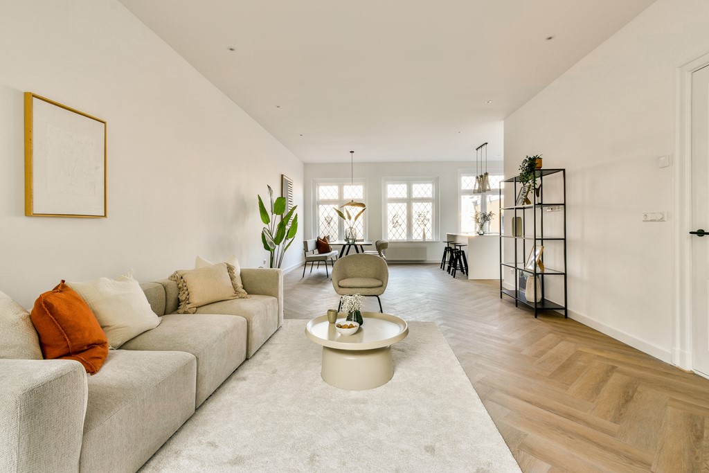 Throughout the home, beautiful herringbone flooring adds timeless elegance. The first floor features original stained-glass windows and the upstairs windows have HR++ double glazing. This along with insulation on all external-facing walls, six solar panels, and a new central heating system (installed in 2025) contribute to an Energy Label A rating and help keep monthly energy costs low.