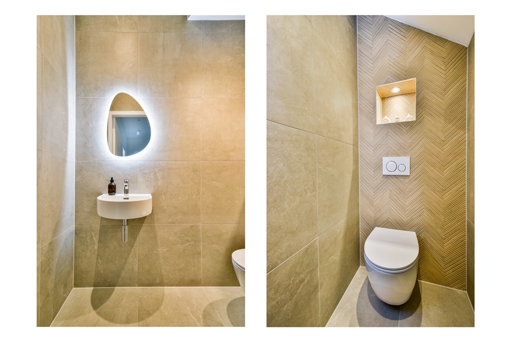 In de gang bevindt zich het moderne toilet, afgewerkt met trendy visgraattegels in houtlook, en daarnaast de stijlvolle badkamer met inloopdouche en een elegant, ovaal marmeren waskom. Alles is tot in de puntjes afgewerkt en volledig instapklaar.