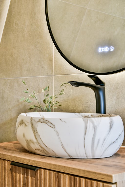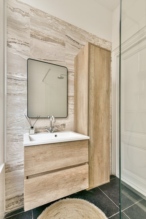 Off the hallway, you’ll also find a modern guest toilet finished with trendy wood-look herringbone tiles, as well as a stylish bathroom featuring a walk-in shower and an elegant oval marble sink. Everything has been finished to the highest standard and is fully move-in ready.